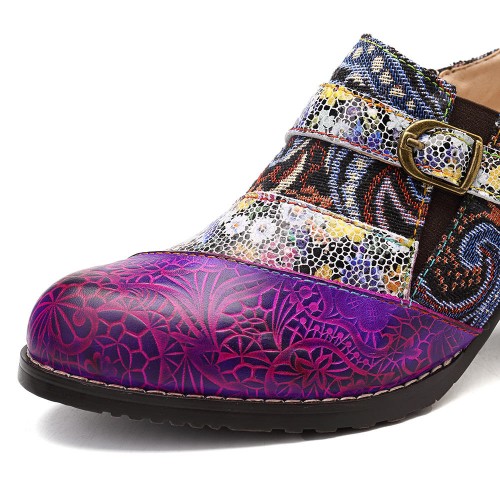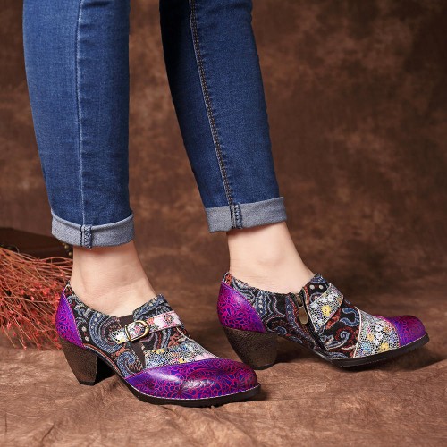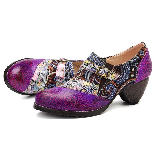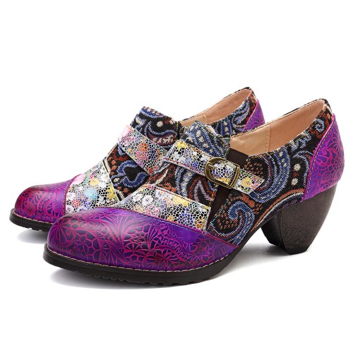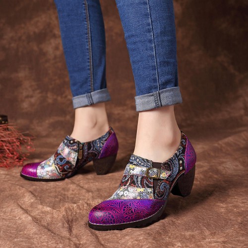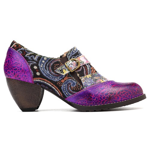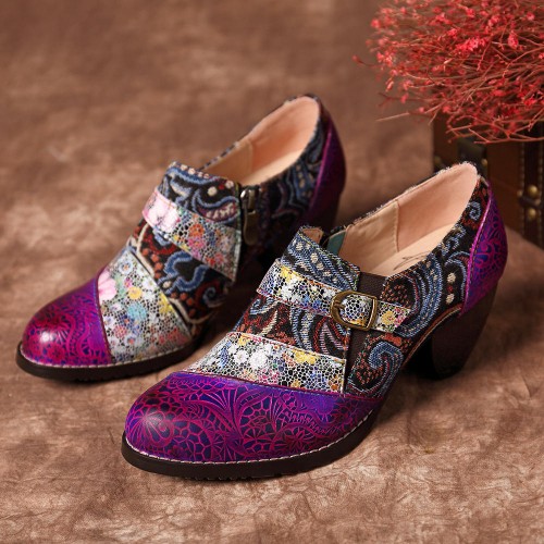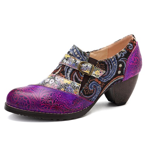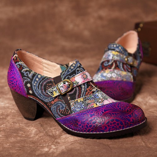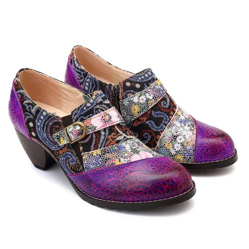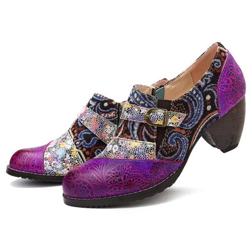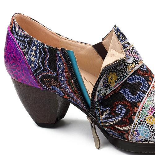 SOCOFY Vintage Splicing Stripe Buckle Zipper Pumps