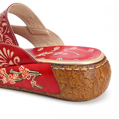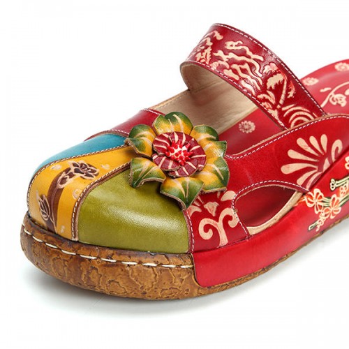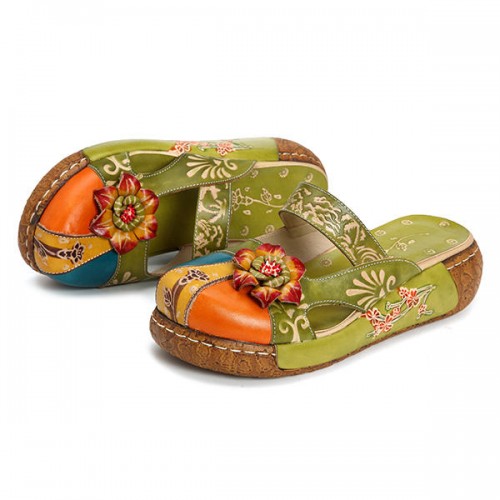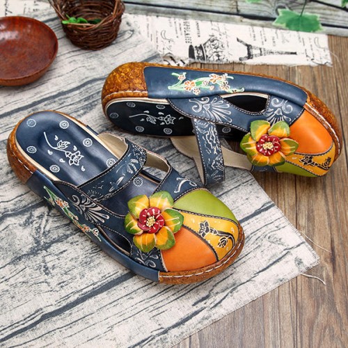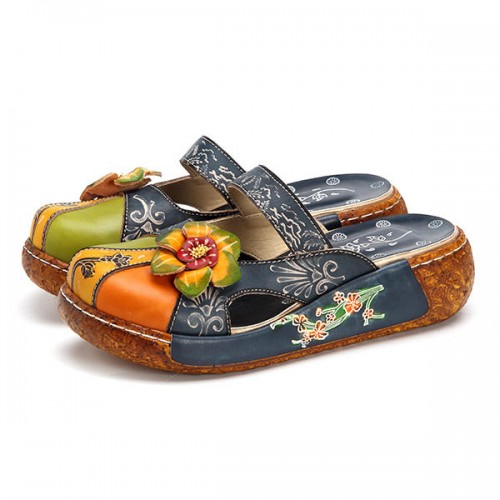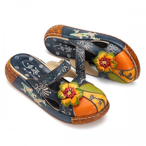 SOCOFY Vintage Colorful Leather Hollow Out Backless Flower Shoes