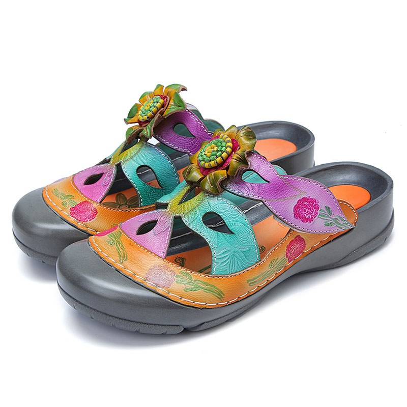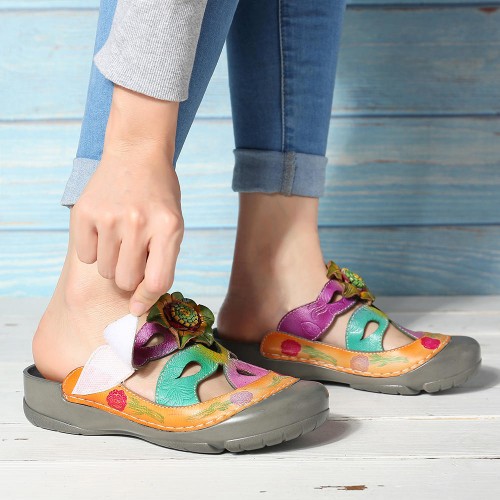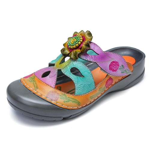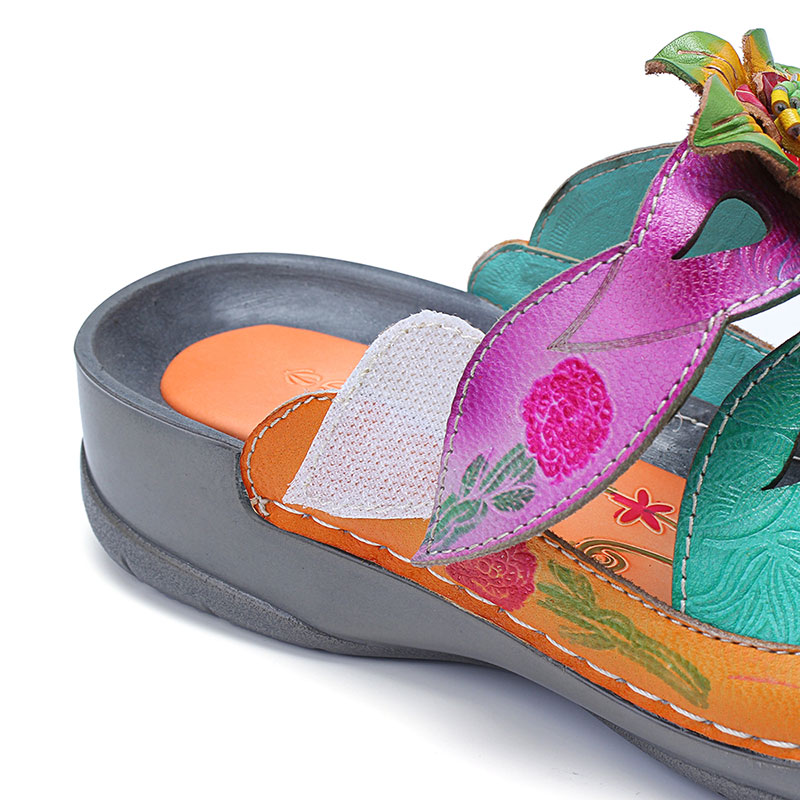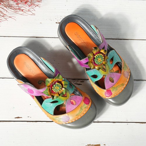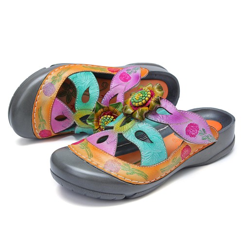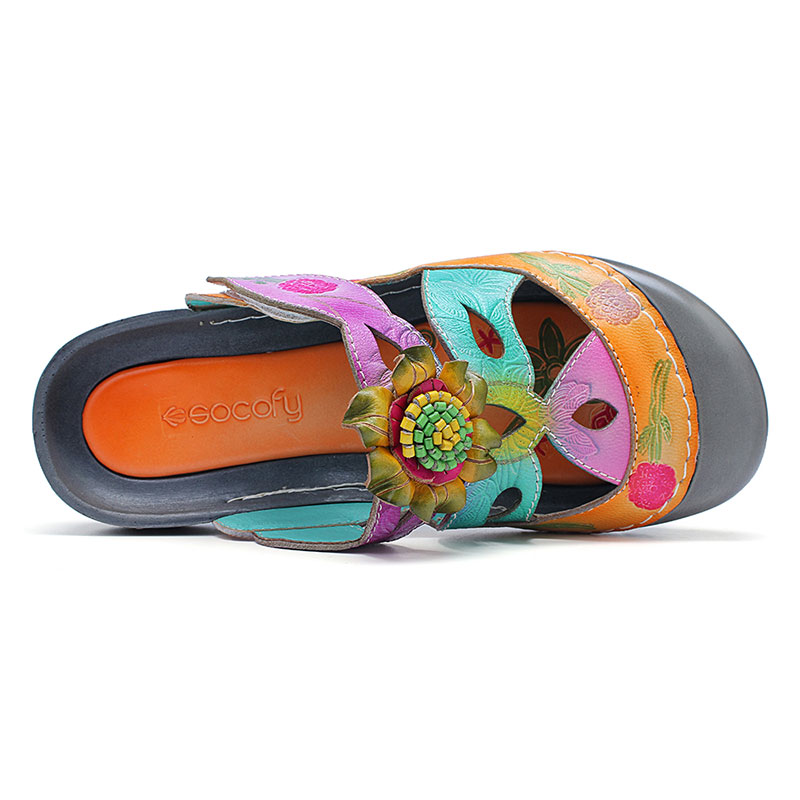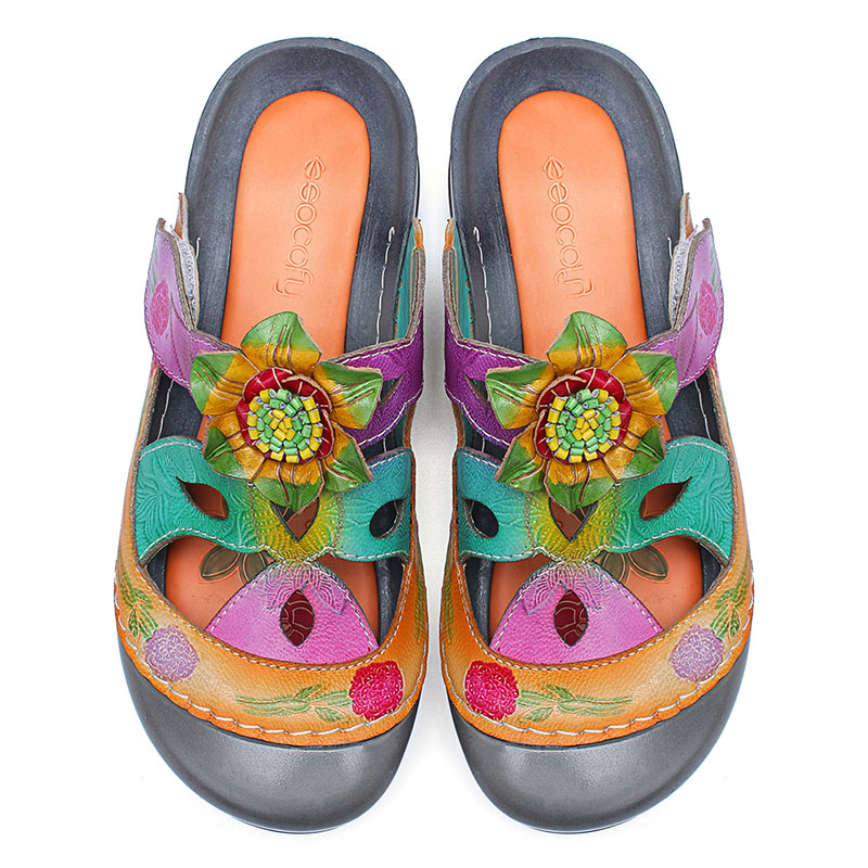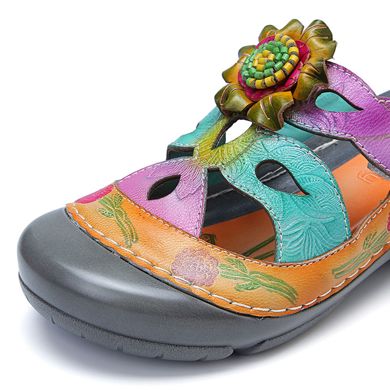 SOCOFY Printing Hollow Out Hook Loop Casual Comfy Leather Sandals