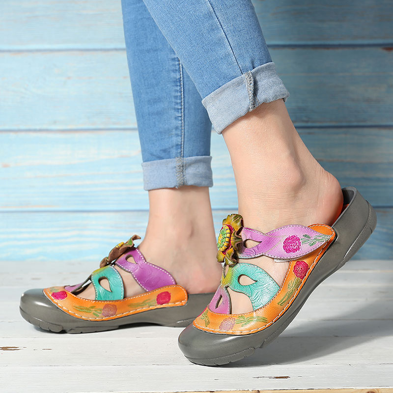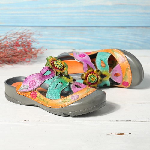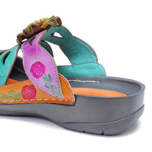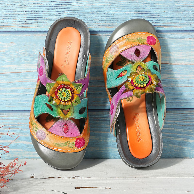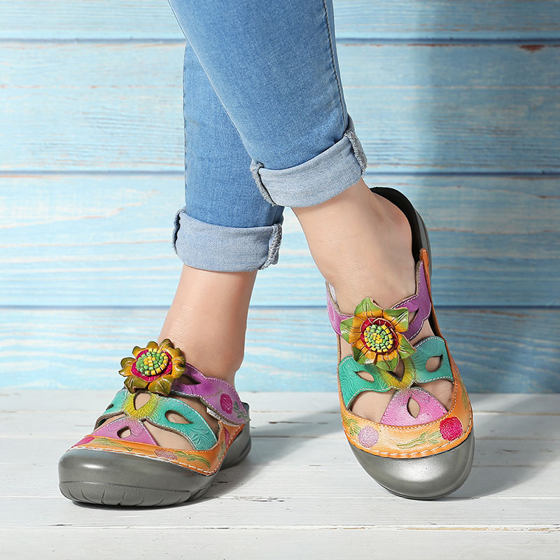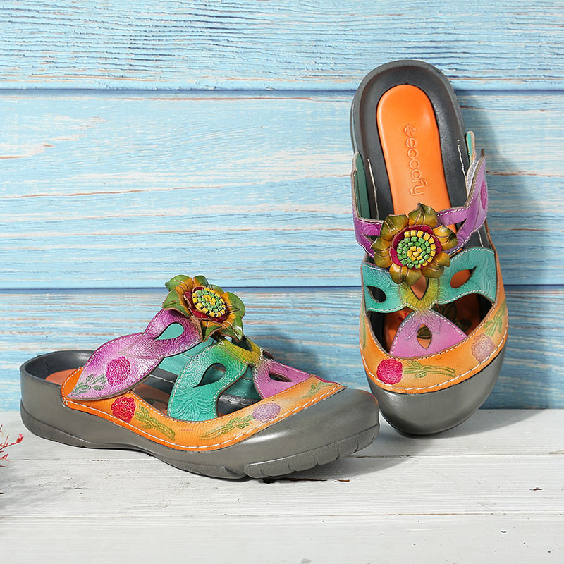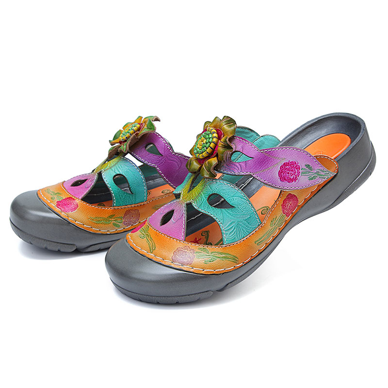 SOCOFY Printing Hollow Out Hook Loop Casual Comfy Leather Sandals