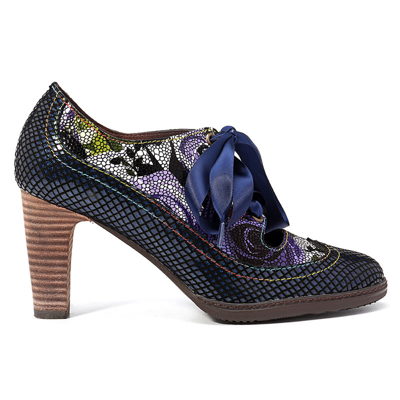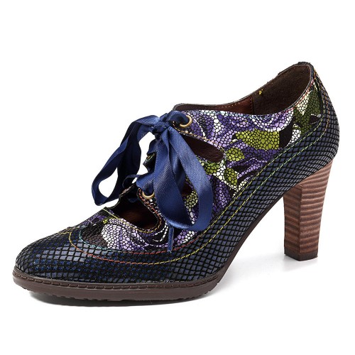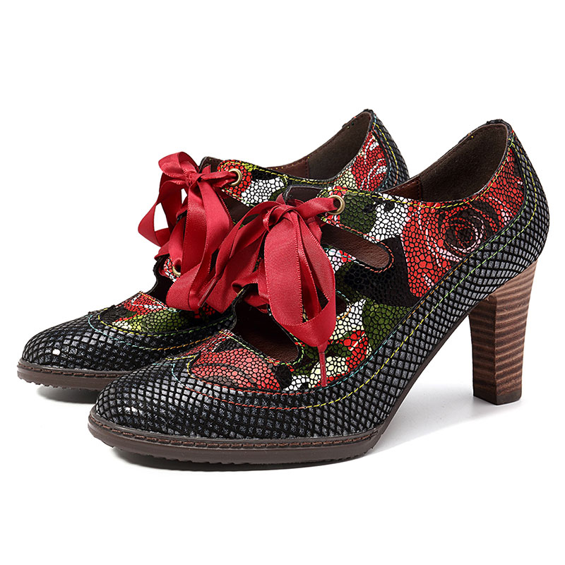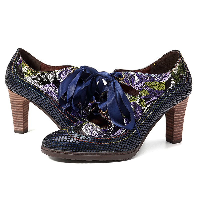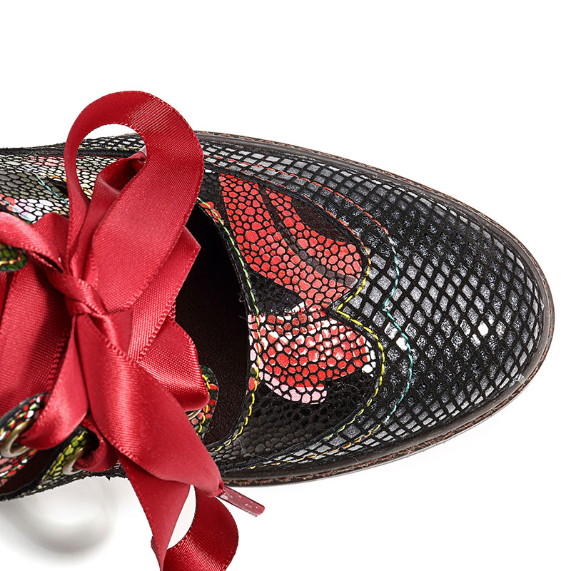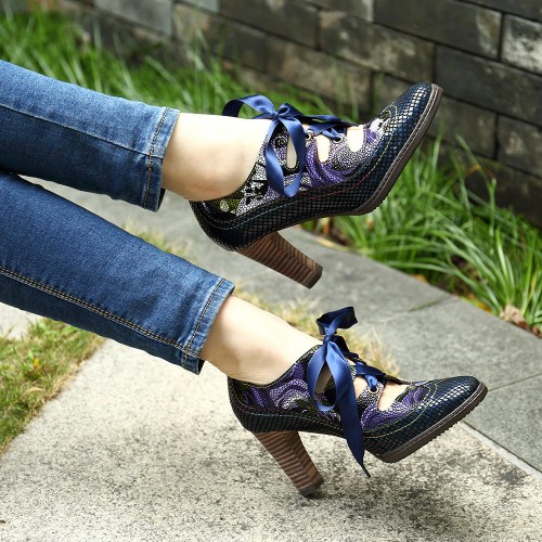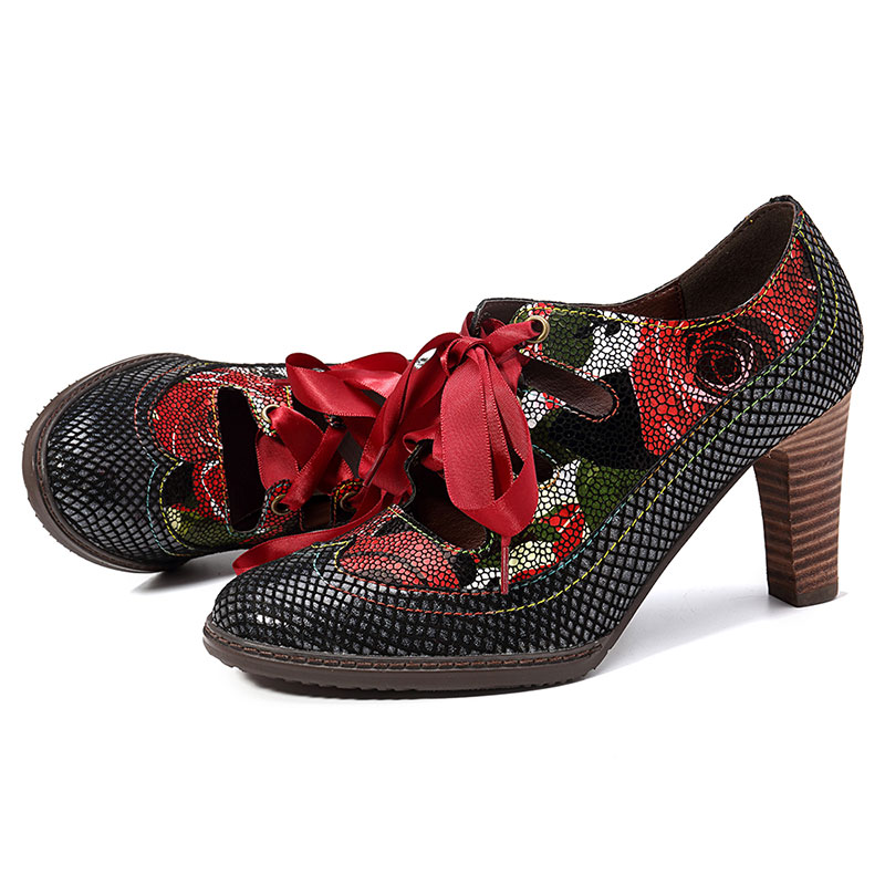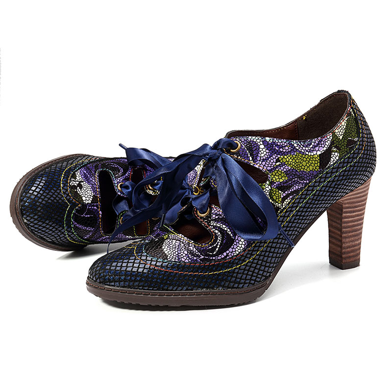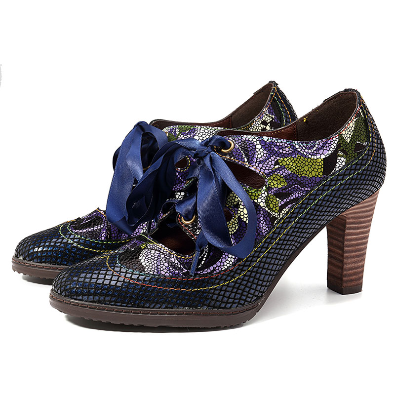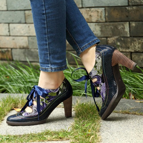 SOCOFY Genuine Leather Serpentine Hollow Out Lace Up Pumps