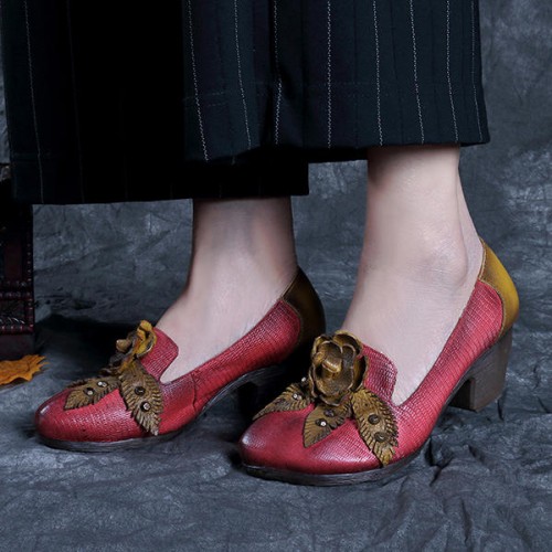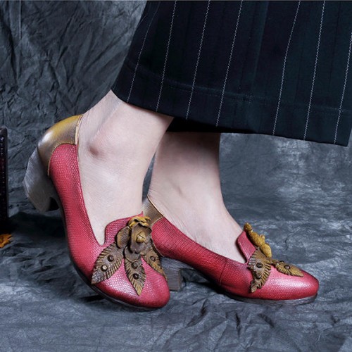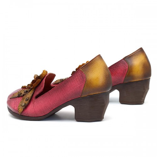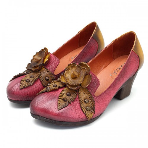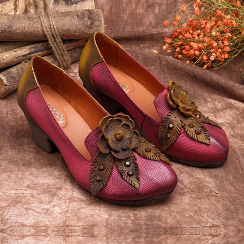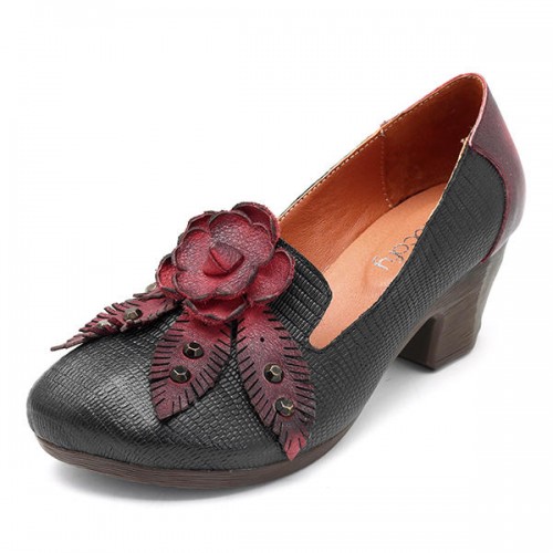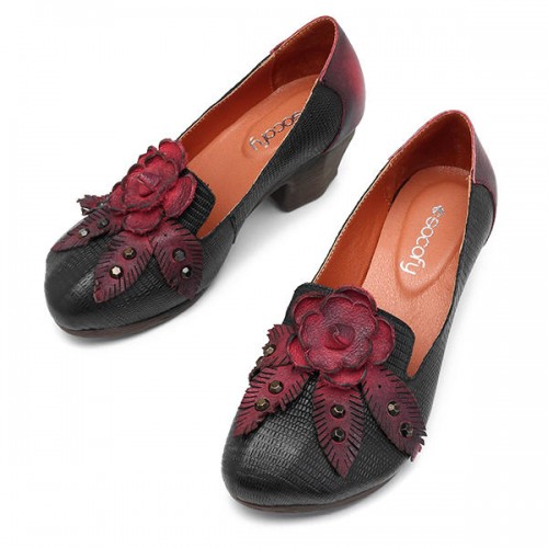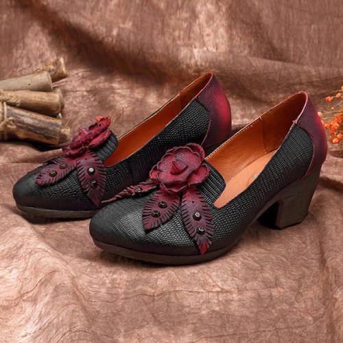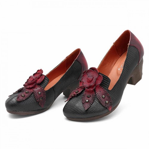 SOCOFY Floral Decoration Mid Heel Ankle Boots Retro Pumps