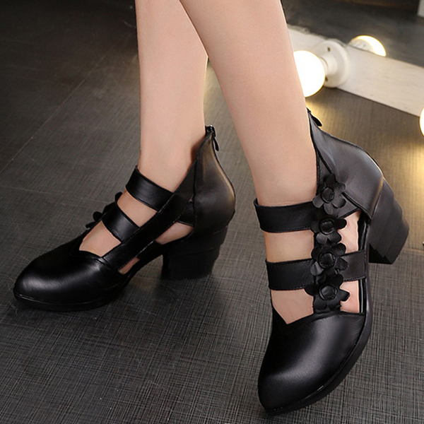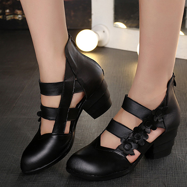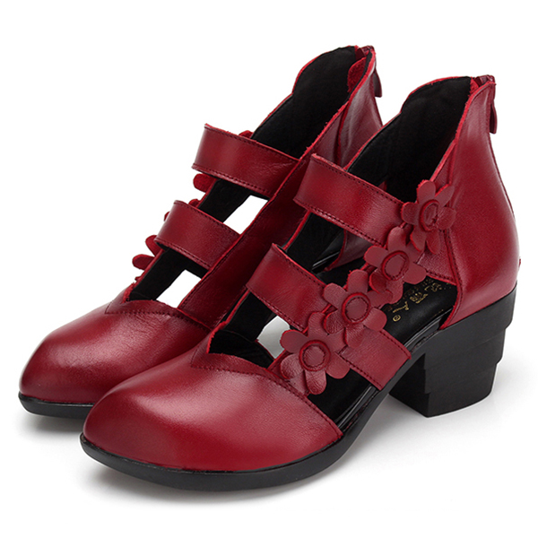 SOCOFY Zipper Genuine Leather Retro Casual Flower Pumps Sandals