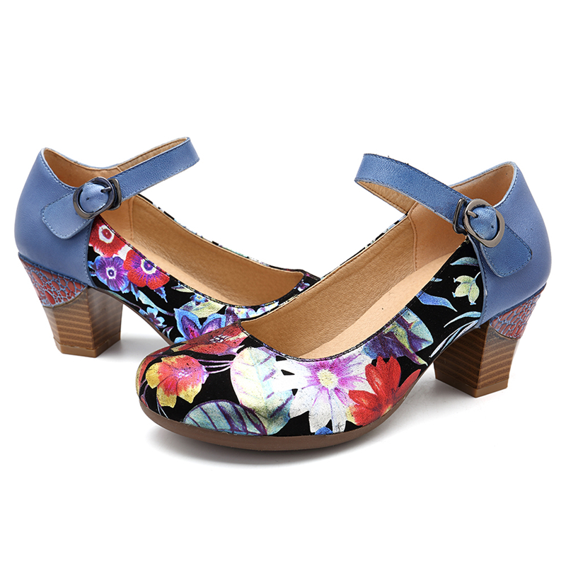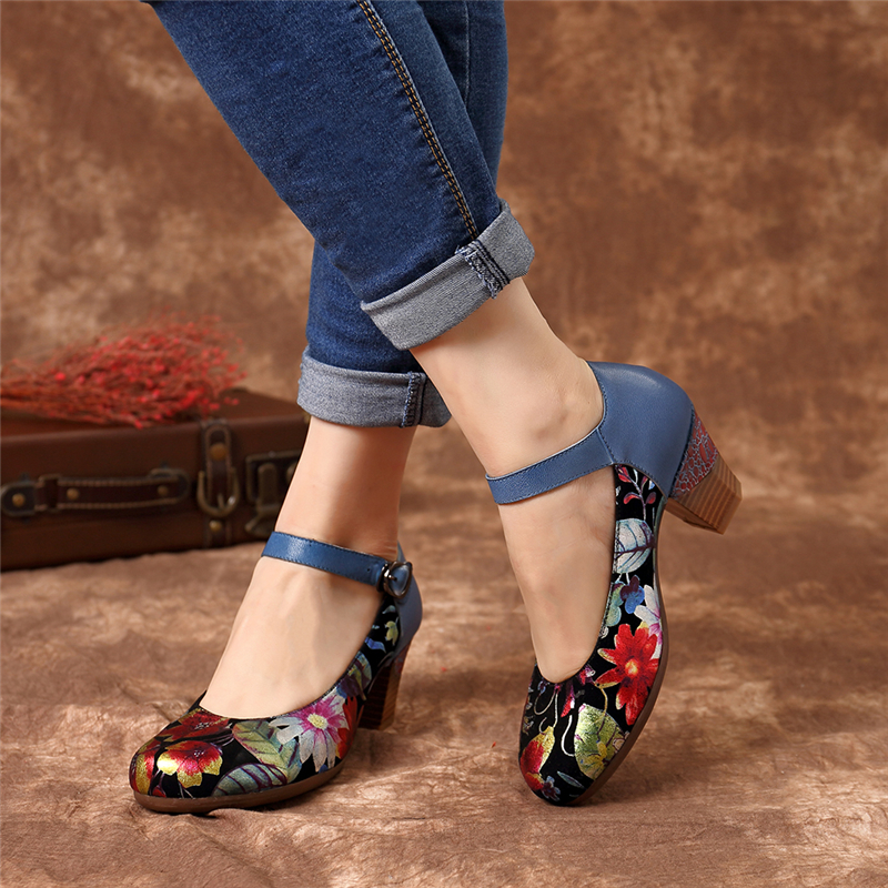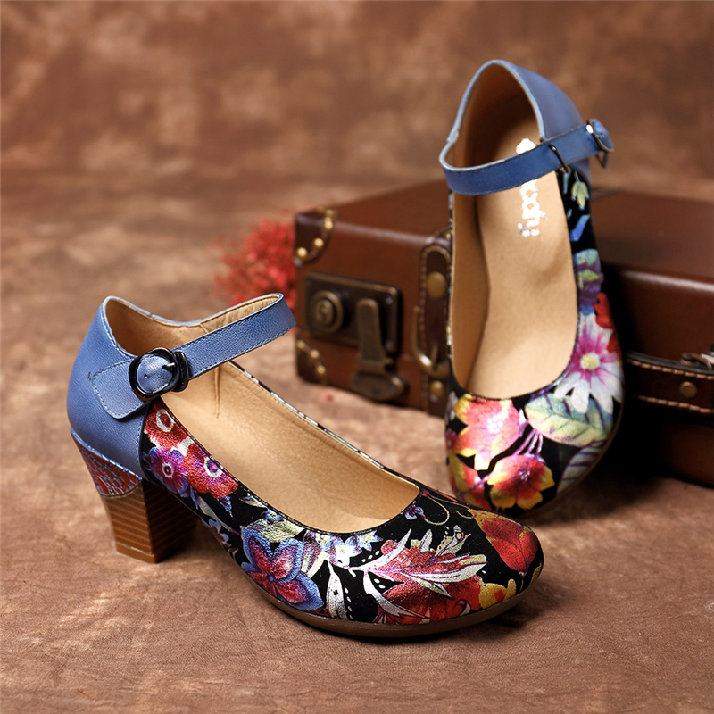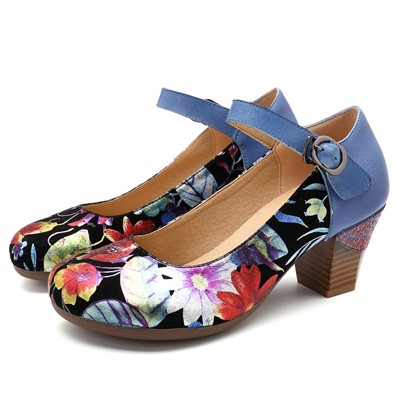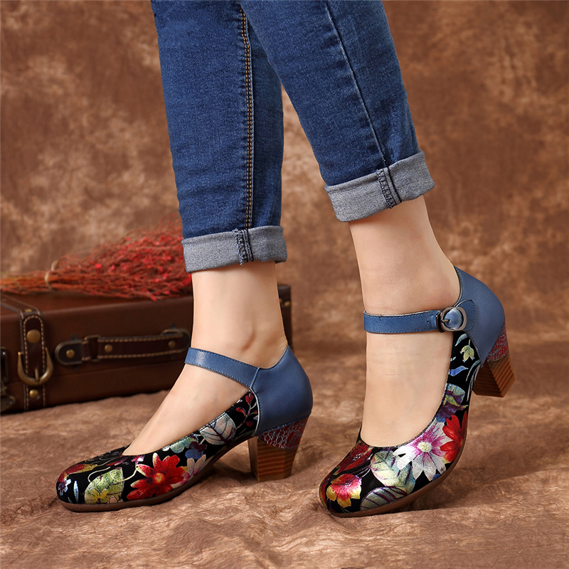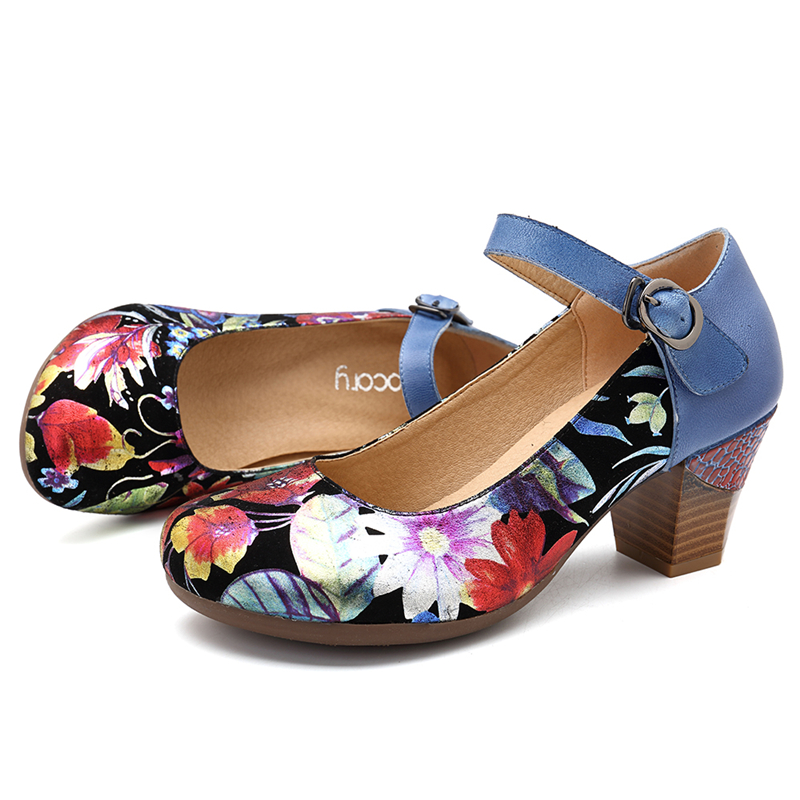 SOCOFY Genuine Leather Ankle Strap Pumps Round Toe Casual Shoes