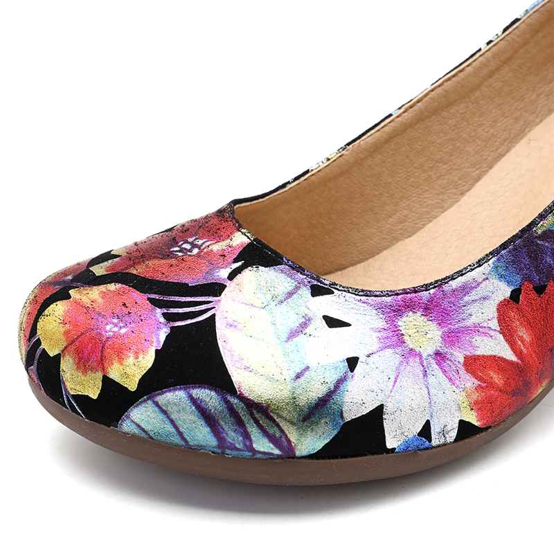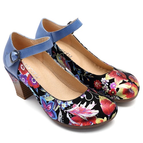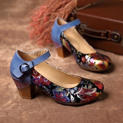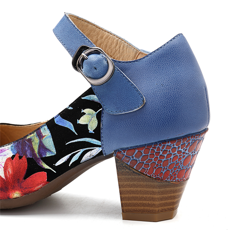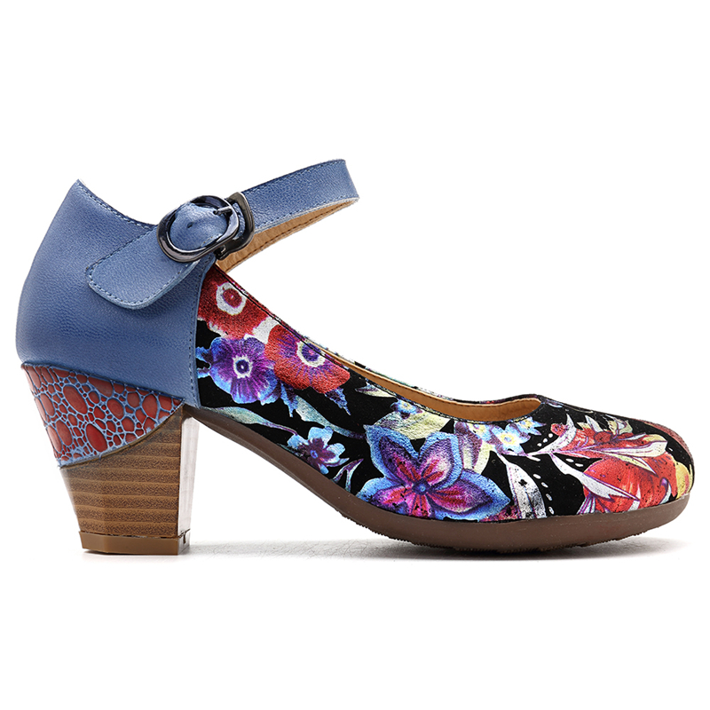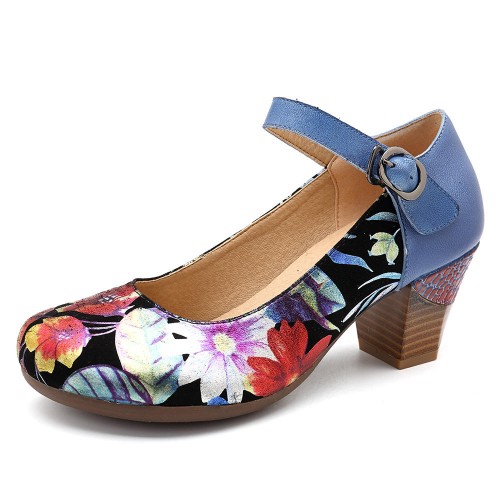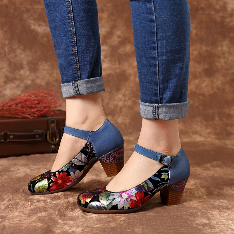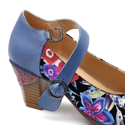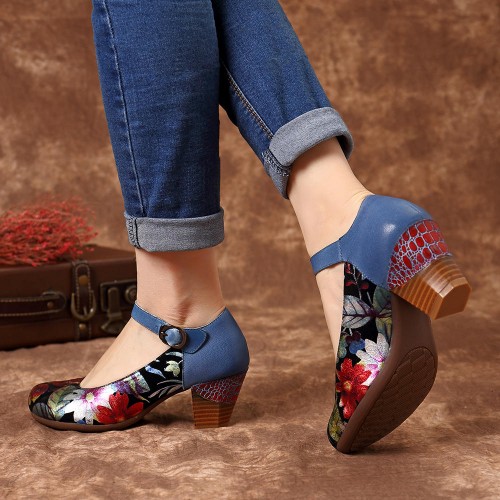 SOCOFY Genuine Leather Ankle Strap Pumps Round Toe Casual Shoes