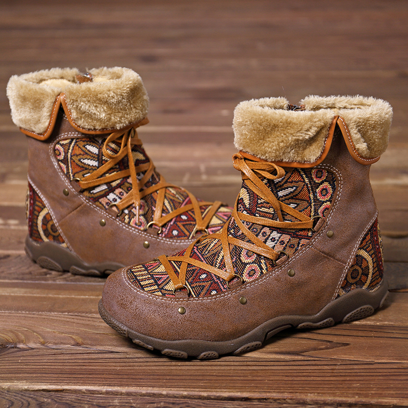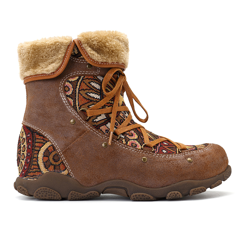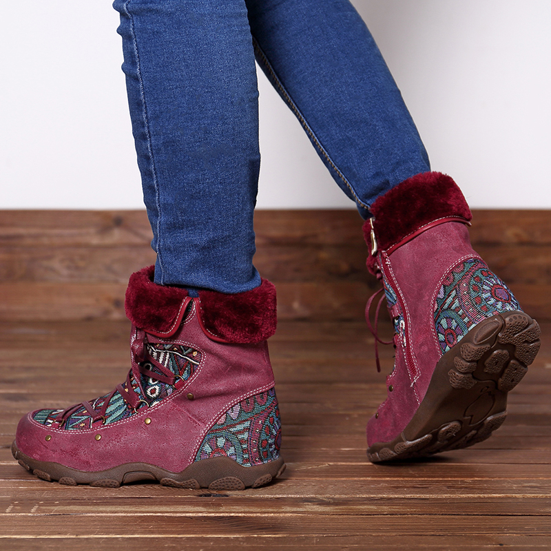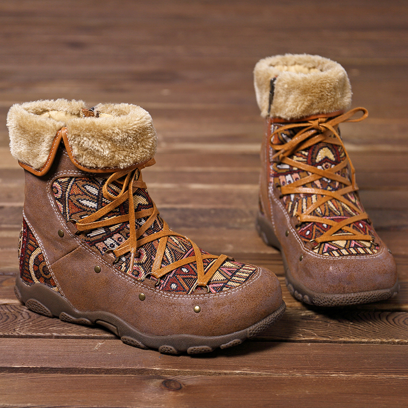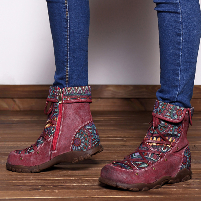 SOCOFY Genuine Leather Splicing Jacquard Pattern Zipper Ankle Boots