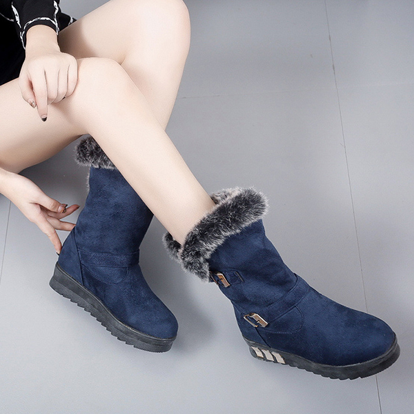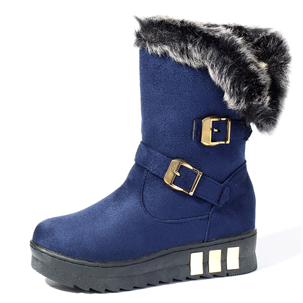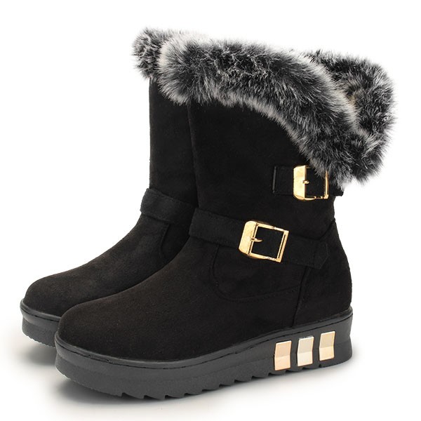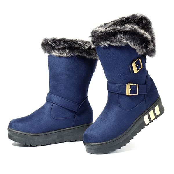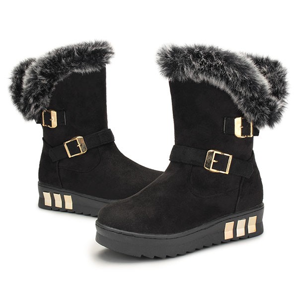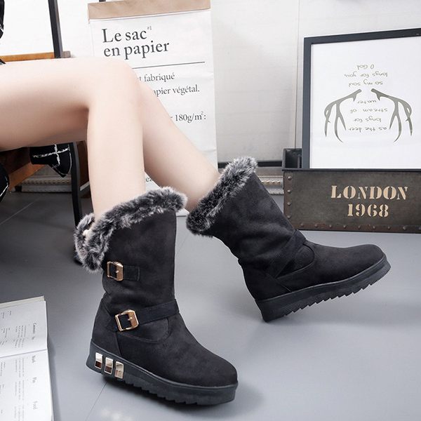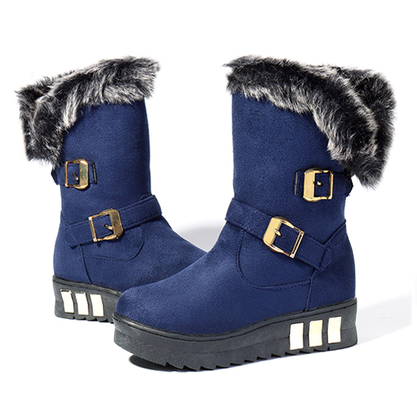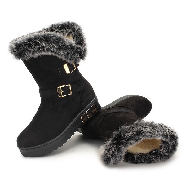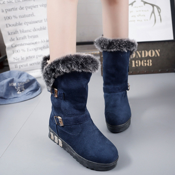 Women Winter Buckle Fur Lining Flat Mid Calf Snow Boots