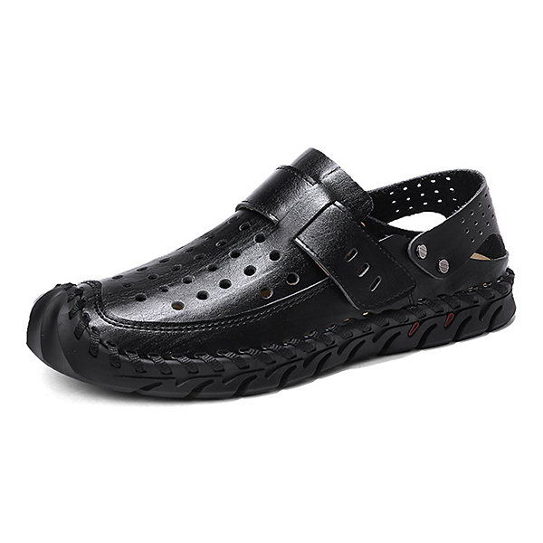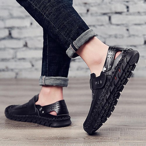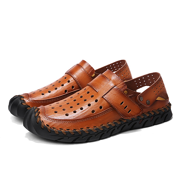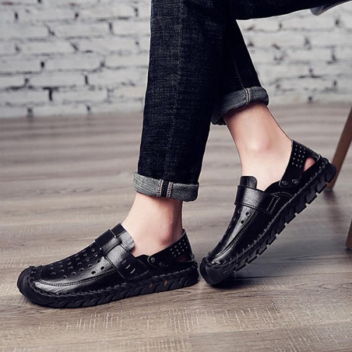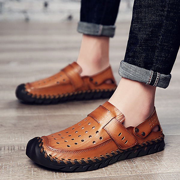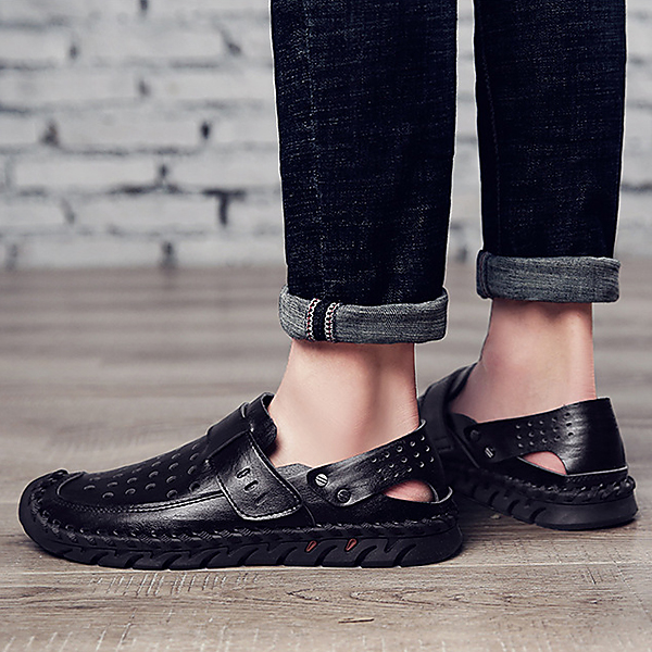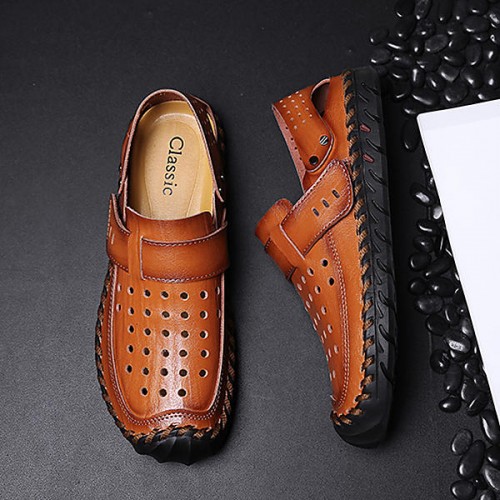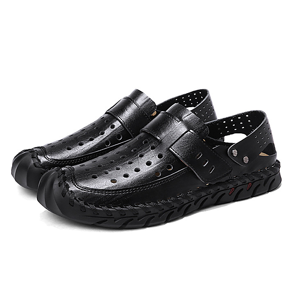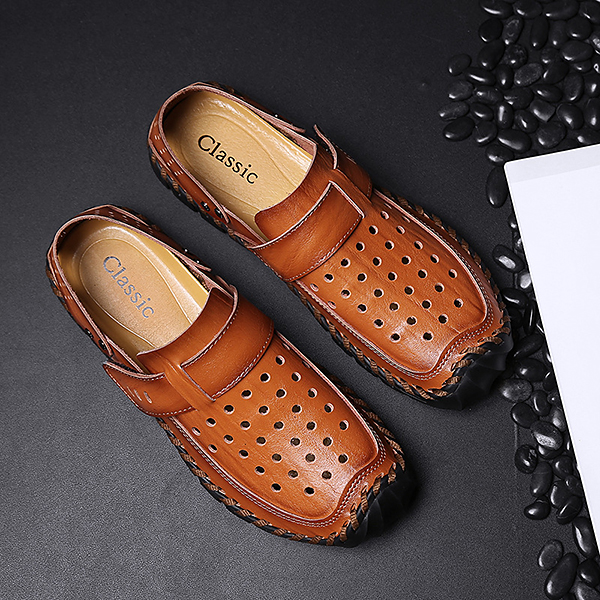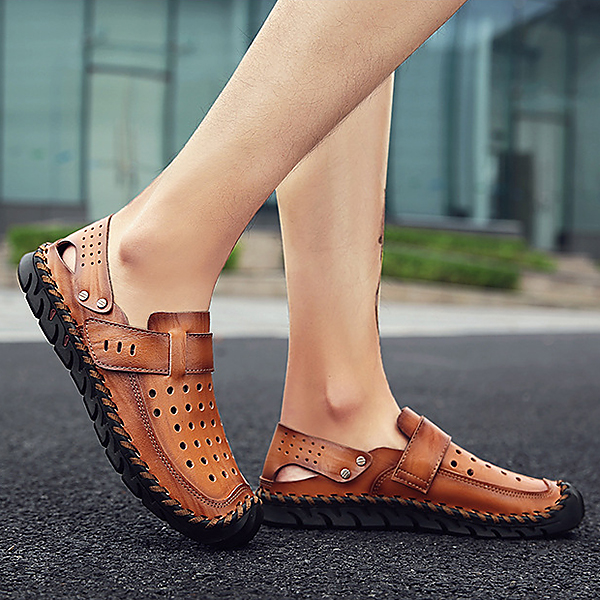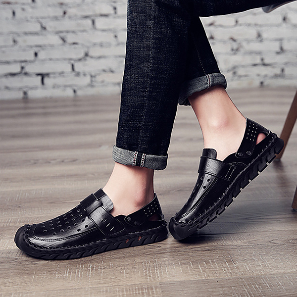 Men Breathable Hollow Outs Genuine Leather Hook Loop Oxfords Casual Shoes