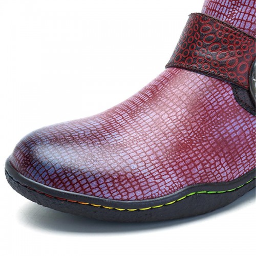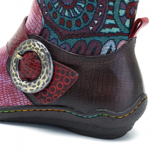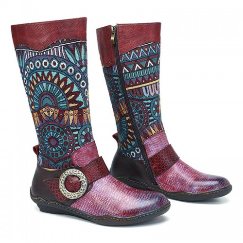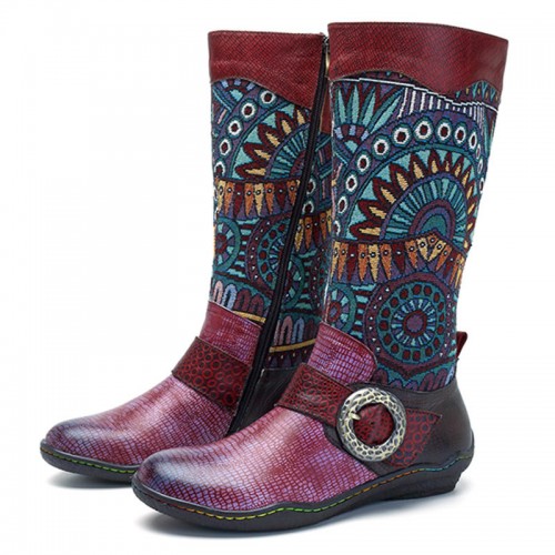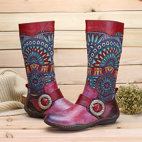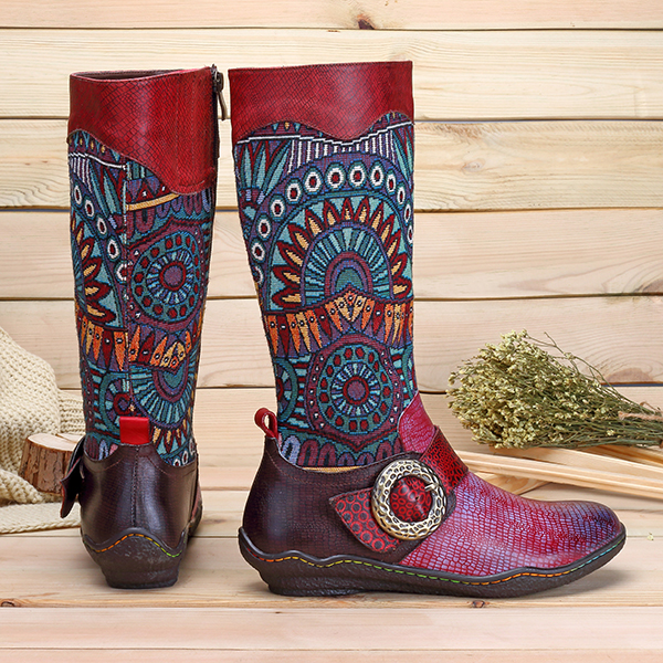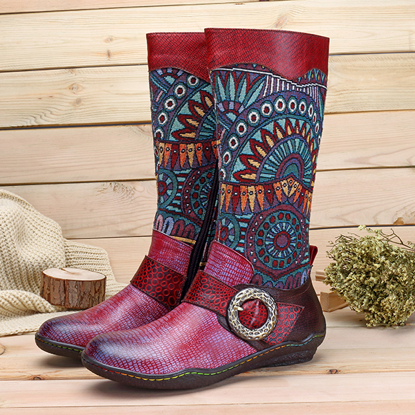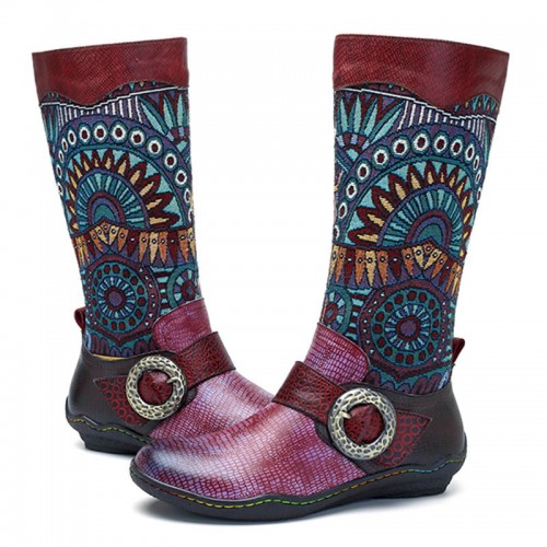 SOCOFY Retro Jacquard Stitching Buckle Flat Leather Mid Calf Boots